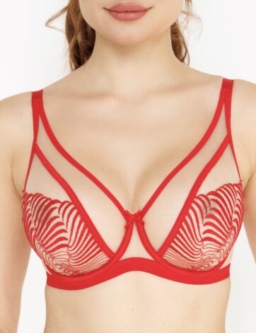 Спокусливий та ефектний бюстгальтер для грудей середнього та великого розмірів. – м’які чашки із симплексу та стійкого тюлю на кісточках. – верх чашок облямований спеціальною еластичною стрічкою для додаткового комфорту. – боковини посилені вертикальними плоскими кісточками у всіх розмірах – бретелі регулюються, не знімаються, ширина залежить від розміру. – Золотий V-подібний декоративний елемент прикрашає арку…