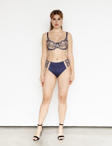 бюстгальтер з ажурного мережива; м’які чашки на кісточках підтримують груди та не додають об’єм; бретелі не відстібаються, регулюються по довжині; спинка з ремінцями; застібається на спині гачками. Матеріал 50% поліамід, 40% поліестер, 10% еластан
