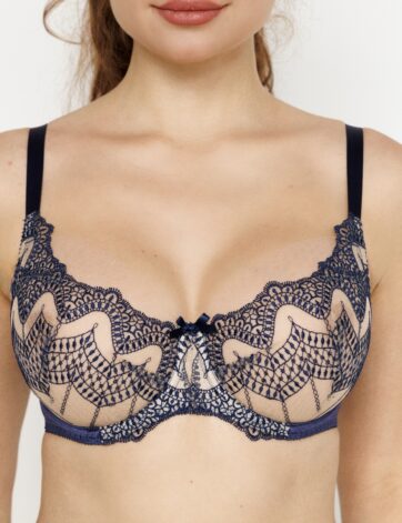 Бюстгальтер з м’якими чашками для власниць середніх і великих грудей. Конструкція піднімає та збирає груди до центру. Чашки з Т-подібними швами, на кісточках. Виготовлені із стійкого тюлю. Верхній край чашки облямований гладкою стрічкою і плавно перетікає в лямку, забезпечуючи кращу підтримку грудей. Пояс бюстгальтера виготовлений із напівпрозорої лайкри, що забезпечує дуже хорошу посадку та підтримку. …