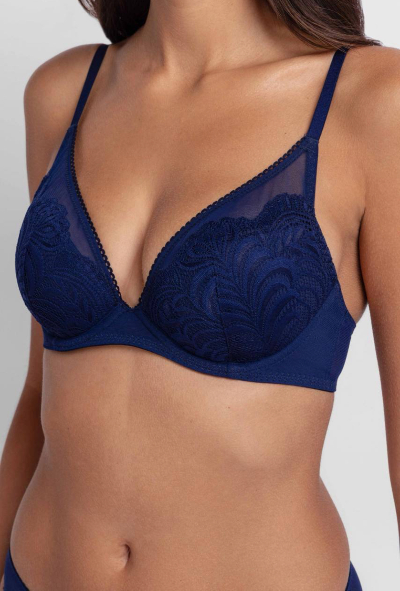 итончений мереживний бюстгальтер у глибокому темно-синьому відтінку виглядає стримано, елегантно та дуже дорого. Насичений колір красиво підкреслює тон шкіри й додає образу впевненості та жіночності.