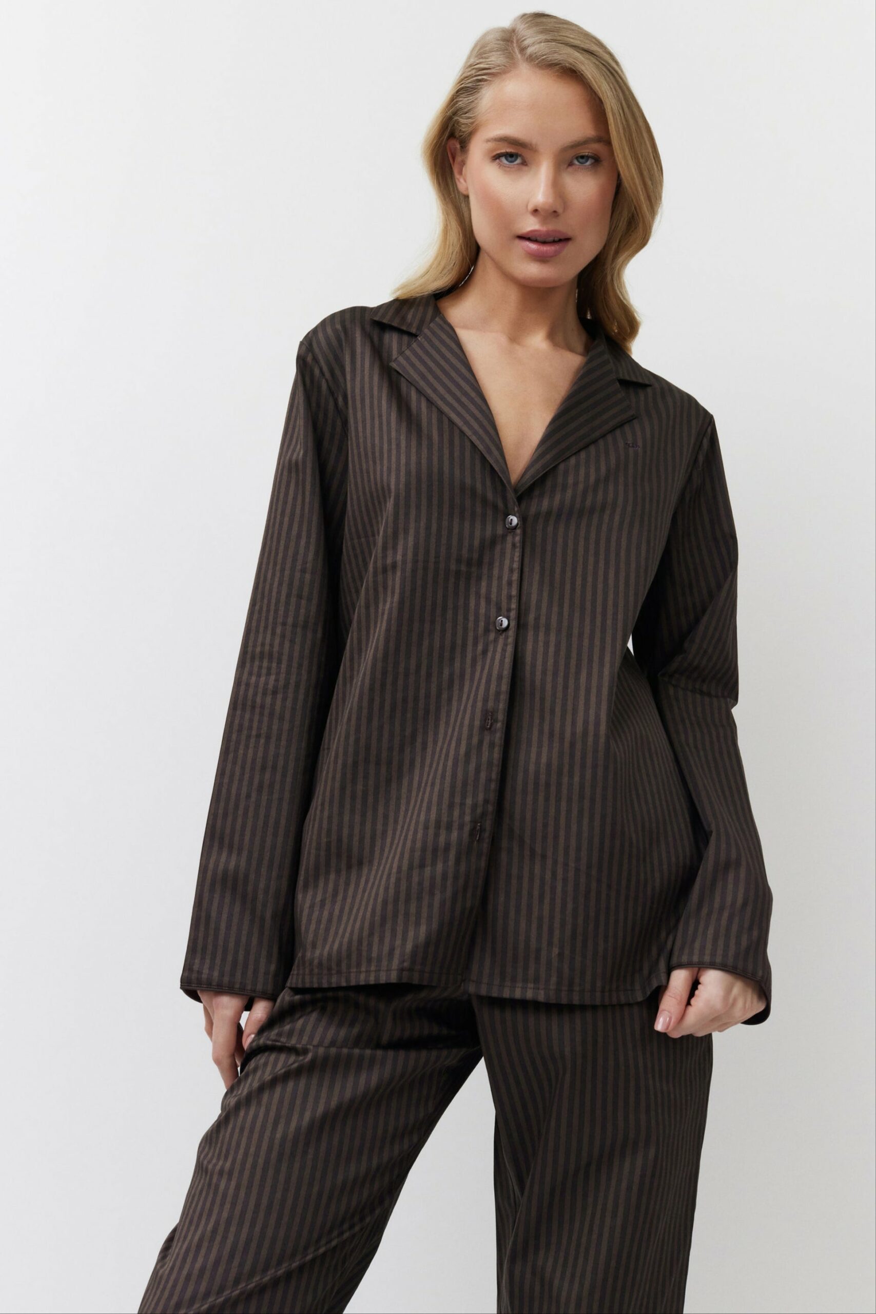 Верх має класичний дизайн сорочки з деталями окантовки рукавів та коричневою вишивкою корони на грудях у тон.