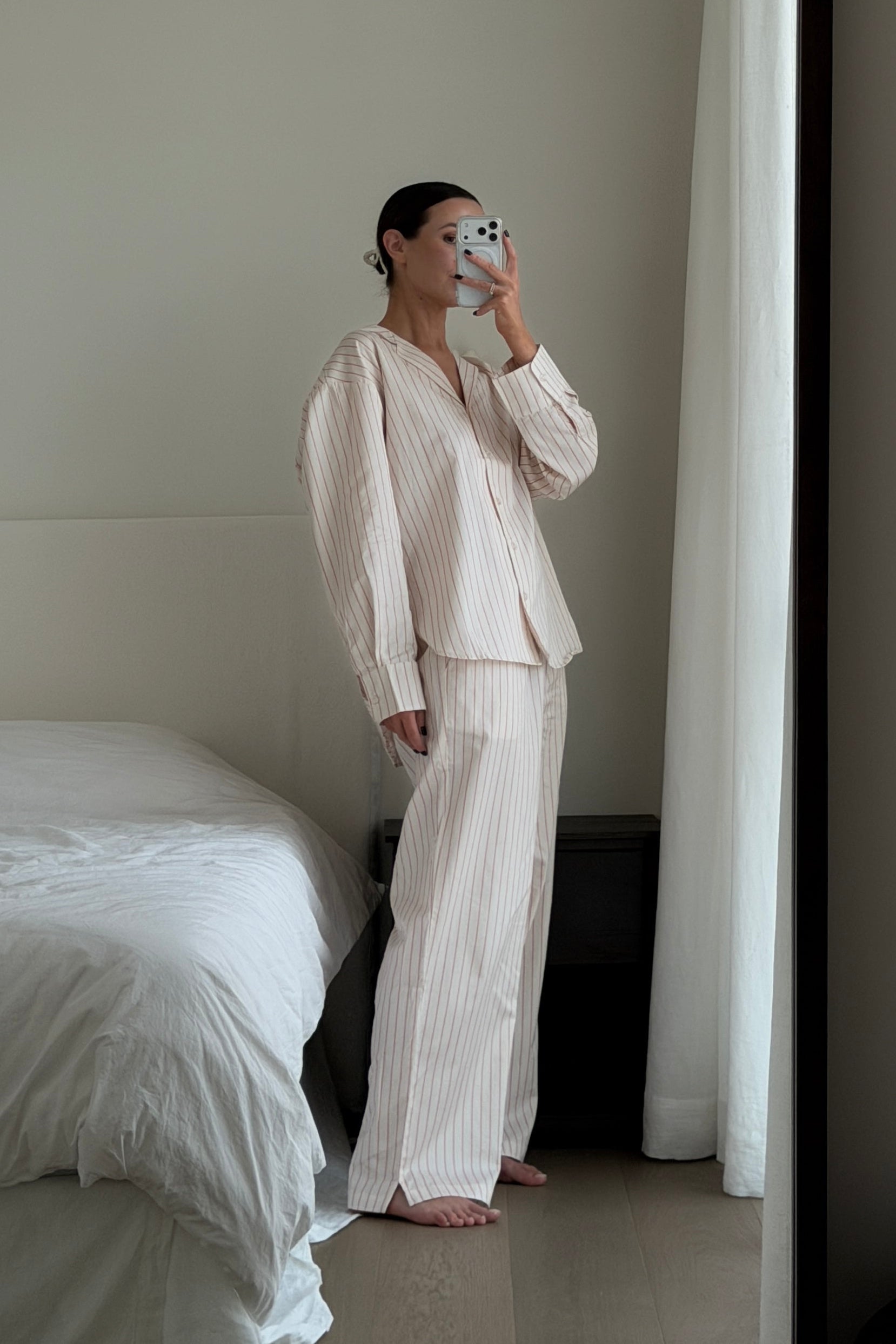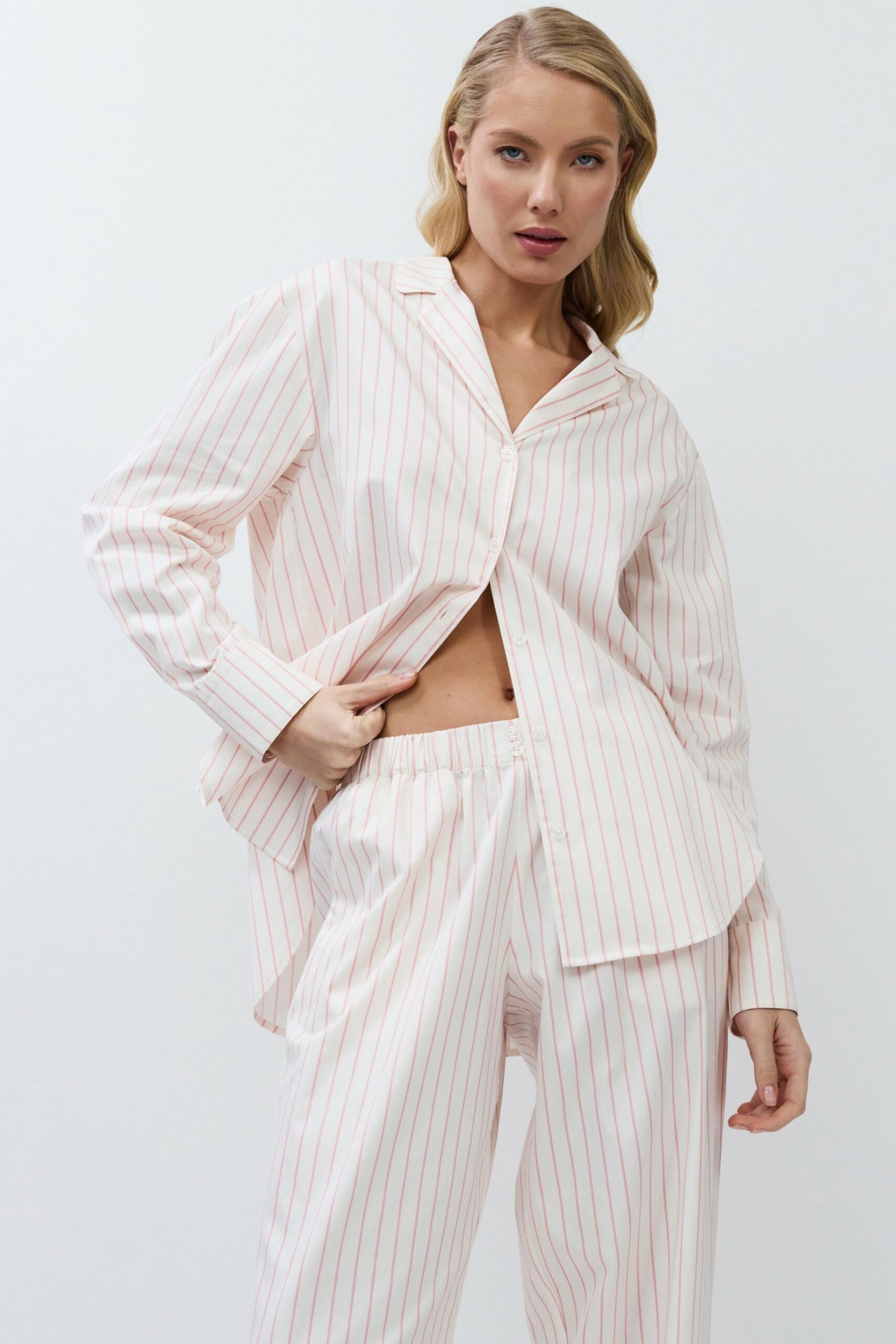 Класичний та романтичний піжамний комплект зі штанами з яскраво-рожевими смужками на світло-рожевому фоні від Aruelle!