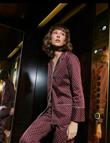 Піжамний комплект насиченого бордового кольору з безшовним геометричним візерунком. Виготовлений з блискучої високоякісної бавовняної тканини поплін. Топ у стилі сорочки має дві кишені. Манжети, кишені, виріз горловини та штанини прикрашені кантом. Золотисті ґудзики. Штани прямого крою з кишенями та регульованим бантом, що зав’язується. Зріст моделі 175 см, розмір S.