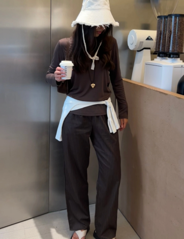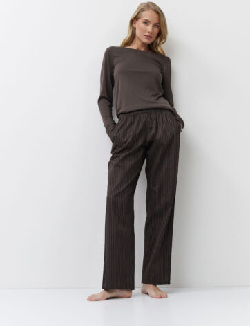 Класичний та шикарний піжамний комплект зі штанами. Верх виготовлений з м’якої та еластичної бавовняної модальної тканини в рубчик. Має приталений крій з рукавами повної довжини. Декорований коричневою вишивкою корони на грудях. Штани виготовлені з розкішної блискучої бавовняної попліну. Мають прямий крой з боковими кишенями. Талія елегантно оздоблена ґудзиками. Зріст моделі 175 см, розмір S.